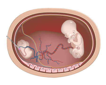 • ولی در دوقلوهایی که دارای کوریون مشترک هستند(در یک ساک بارداری هستند)، بهترین روش، تابش لیزر و حذف عروق خونی مشترک با هدایت سونوگرافی است که البته در حدود 5%، ریسک سقط دارد.